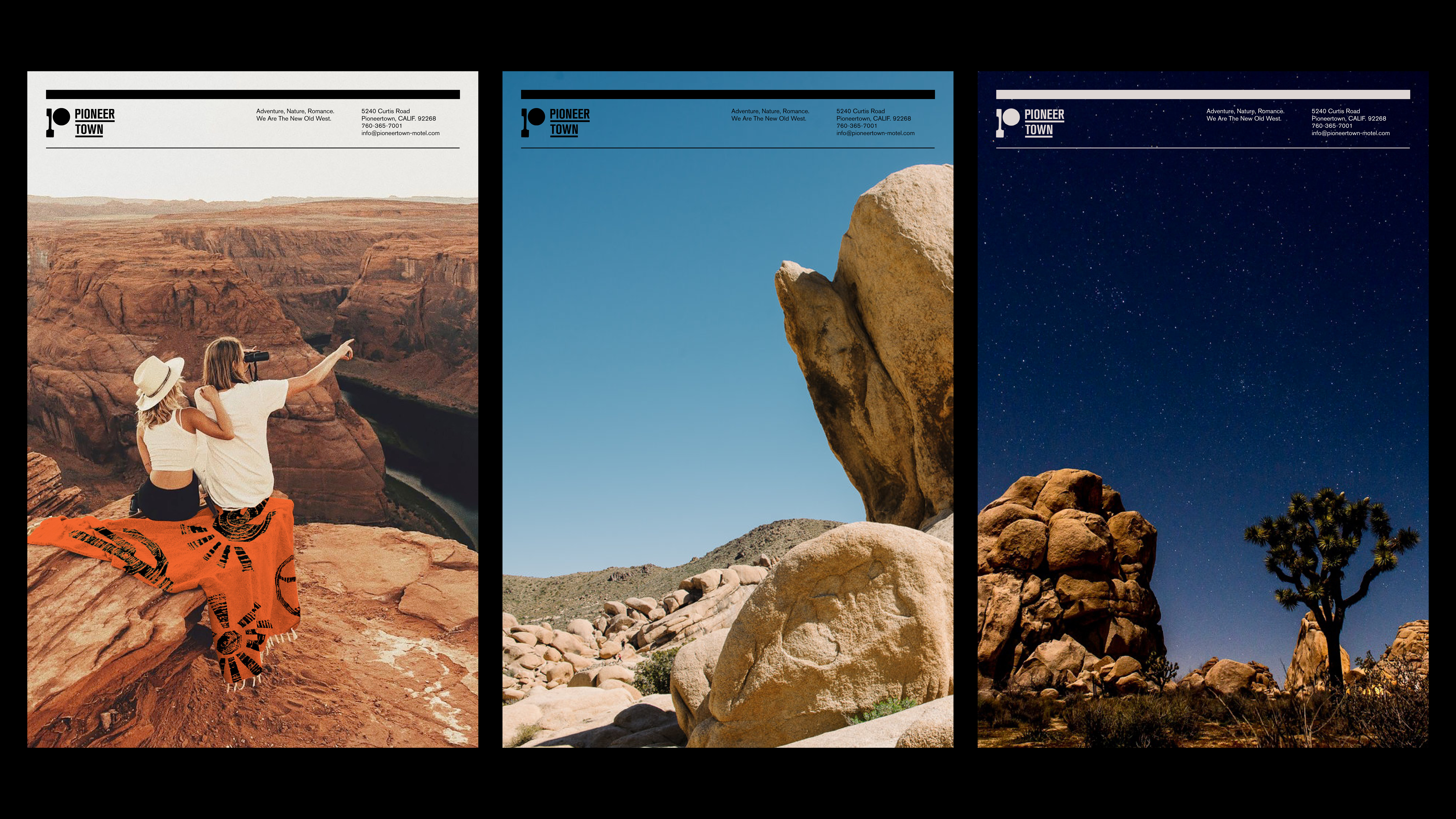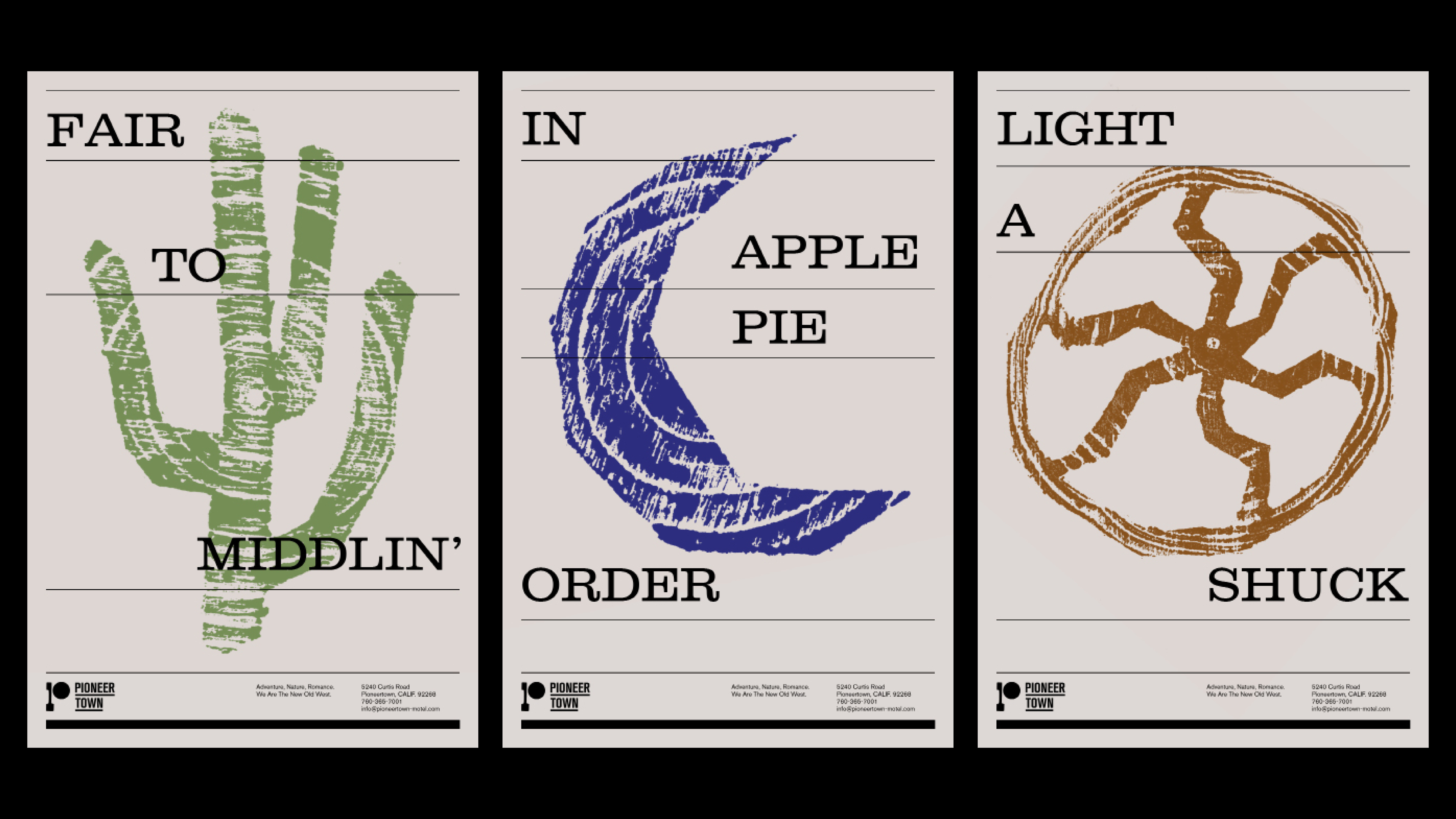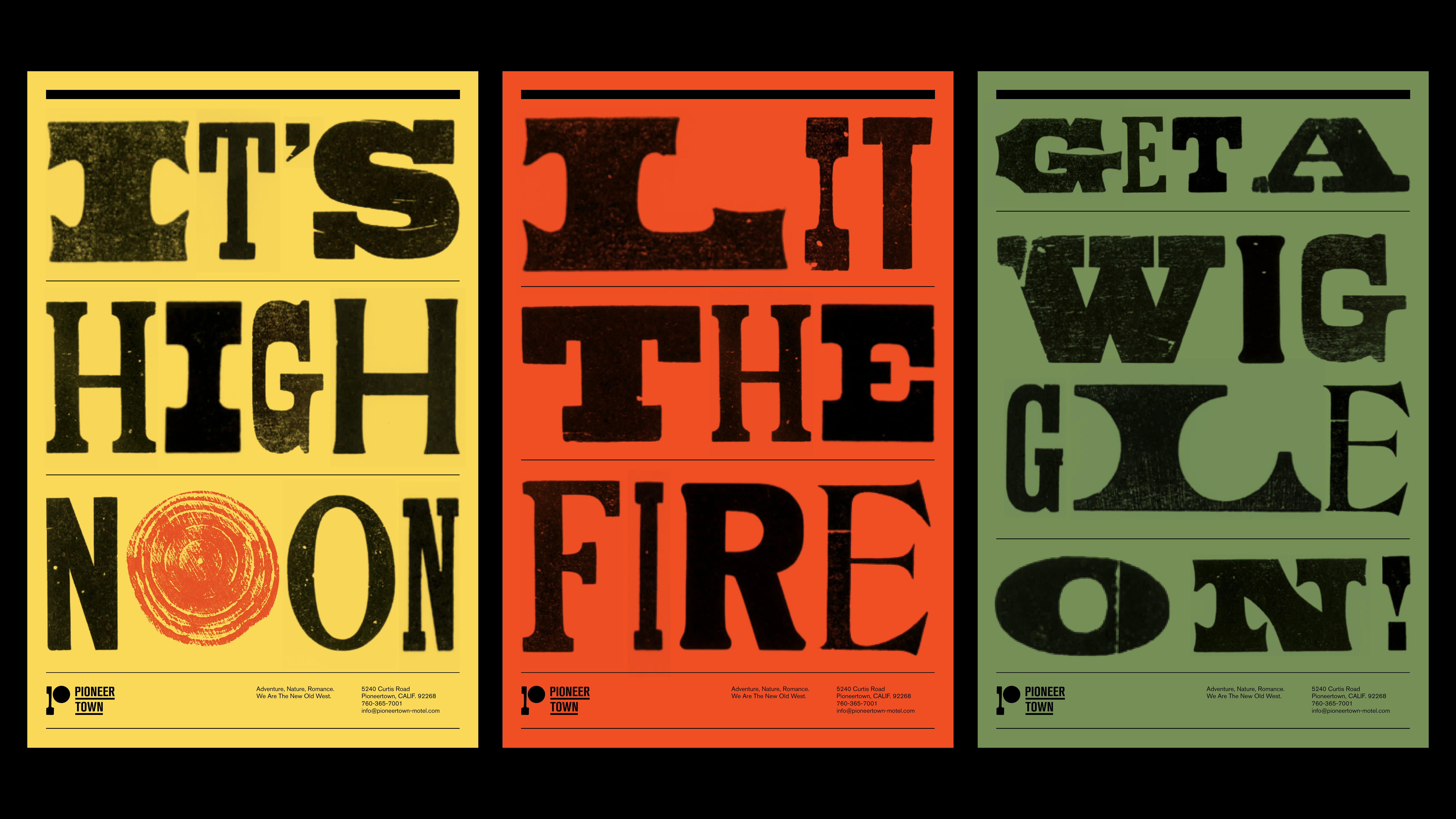 The Pioneertown Motel is an existing dusty inn in the middle of the desert in Southern California, close to Joshua Tree National Park. I updated the visual identity to really show the old west history and culture, as well as the adventurous and romantic spirit of the place. I used analog wood cutting and printing, woodtype and vivid colors to capture the great and fresh western vibe.